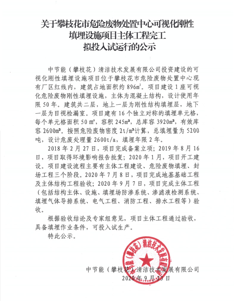 關于攀枝花市危險廢物處置中心可視化剛性填埋設施項目主體工程完工擬投入試運行的公示